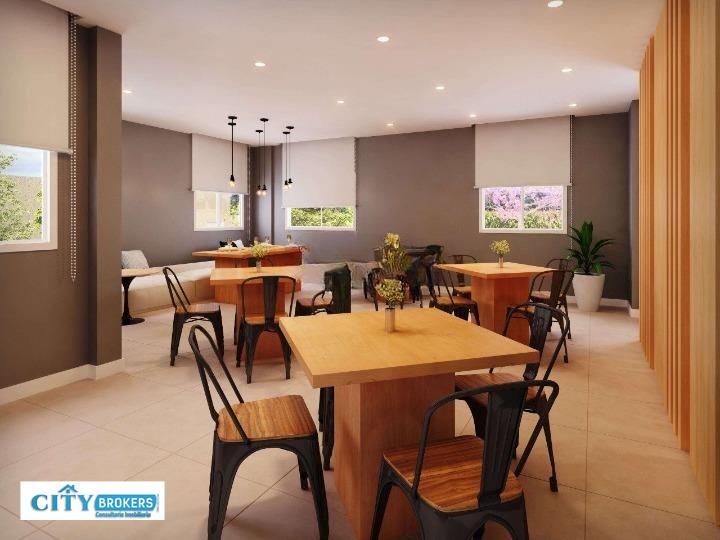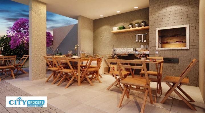 Apartamento 34m², 2 dormitórios, lavabo, banheiro social, sala para dois ambientes, cozinha e área de serviço.