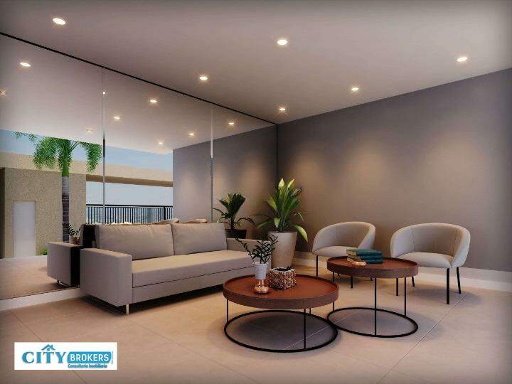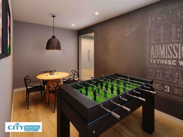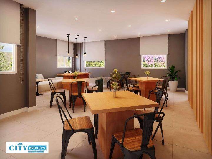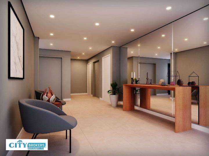 Apartamento 34m², 2 dormitórios, lavabo, banheiro, sala, cozinha e área de serviço.