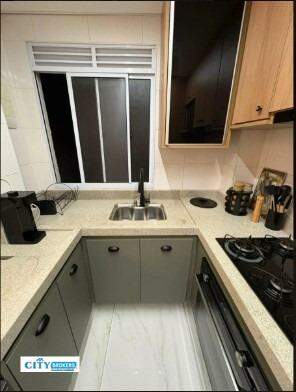 - Cozinha funcional com bancada em mármore branco com cooktop e forno já instalado, integrada a área de serviço.