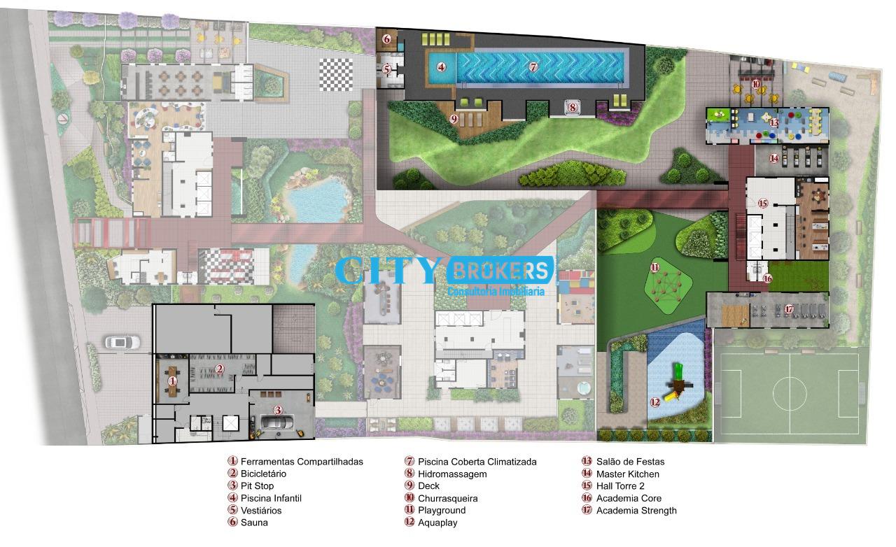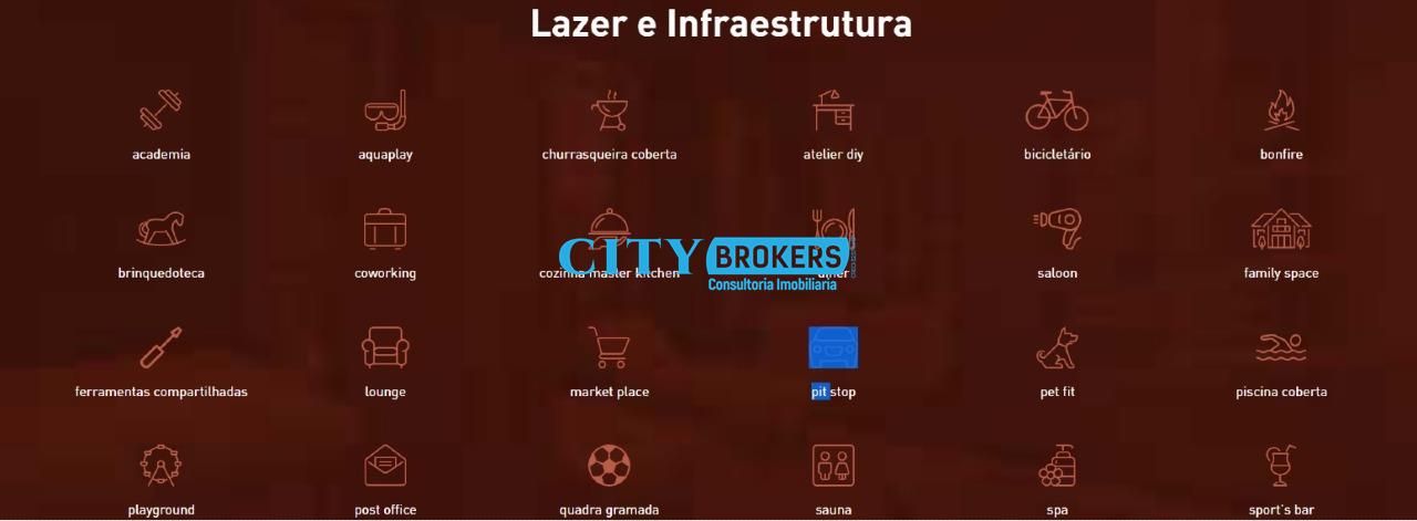Wine Room, Spa, Market,Place, Coworking, Lounge,Playground, Lúdico, Bicicletário, Sauna, Piscina Infantil, Floresta de Bolso, Pit Stop, Espaço Beleza, Brinquedoteca, Espaço Jovem, Studio,,Youtubers,Bon Fire, Cozinha Master Chef, Aquaplay ,Bike Share, Vestiários, Diner, Family Space, Galeria de Artes, Atelier, Luta e Yoga, Post Office, Churrasqueira, Fitness, Pet Fit, Oficina de Veículos, Piscina com Raia Coberta e Climatizada, Quadra, Gramada, Rooftop e Mirante.